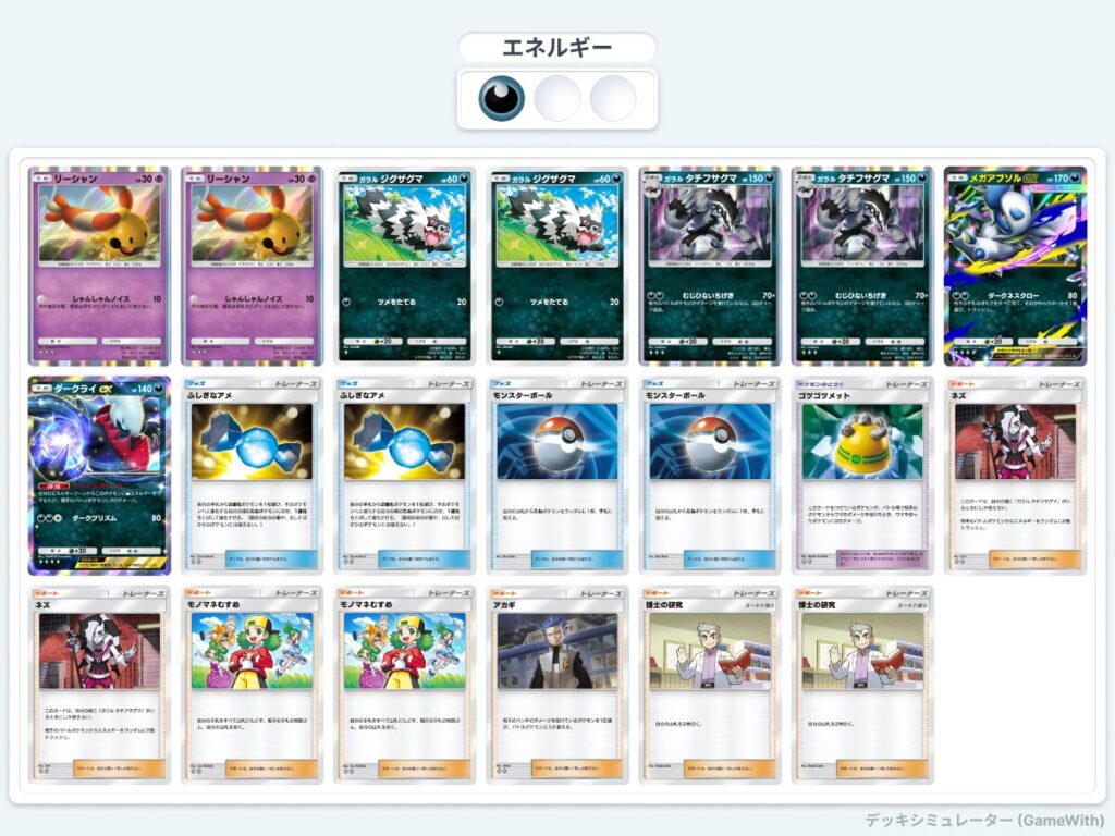 リーシャンで相手を遅らせている間にタチフサグマを準備。必要エネルギーも2つで済むため、ダークライexに回すことで相手にダメージを与えることができる。
