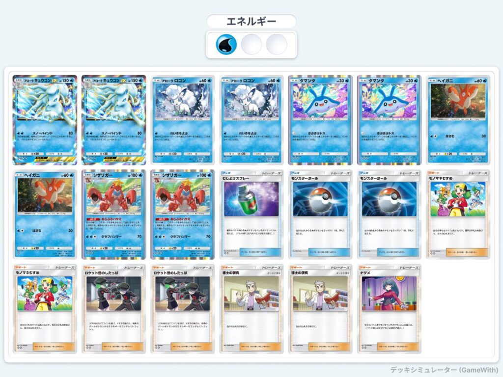ロケット団のしたっぱ、シザリガーで相手のエネルギーを破壊し、アローラキュウコンexでロックするデッキ。