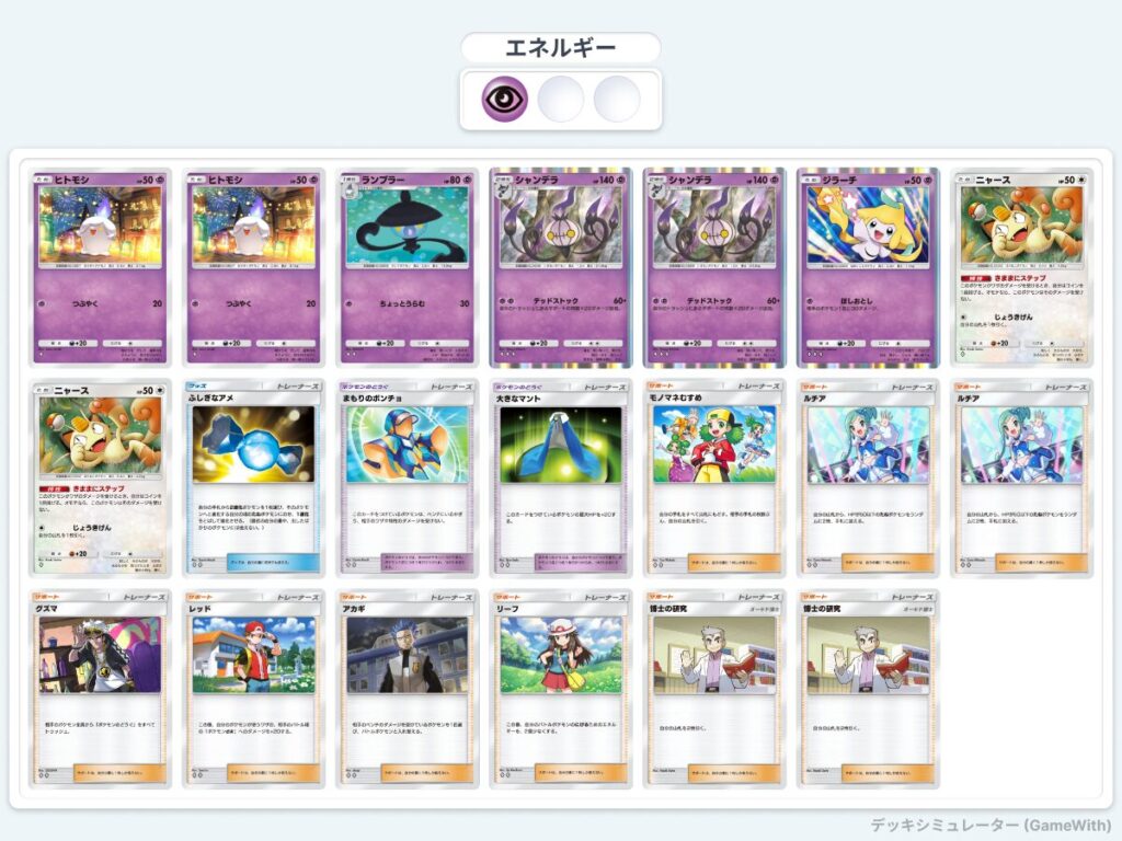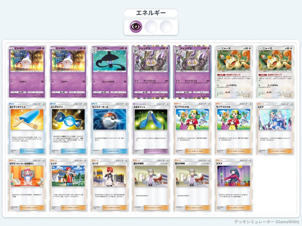 ニャースの延命で焦らしつつ、デッキ圧縮をしていく。その間にサポートカードを使い、シャンデラのダメージを上げていくデッキ。