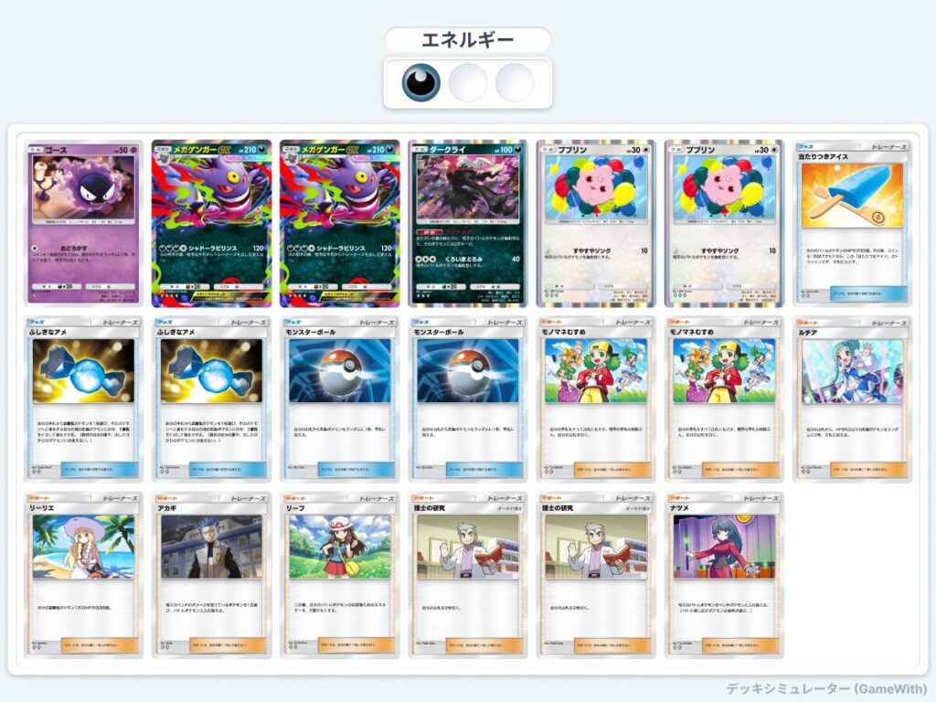 ププリンでねむりを入れることで、ダークライの特性「ナイトメア」の20ダメージを入れつつ、メガゲンガーexを育てていくデッキ。