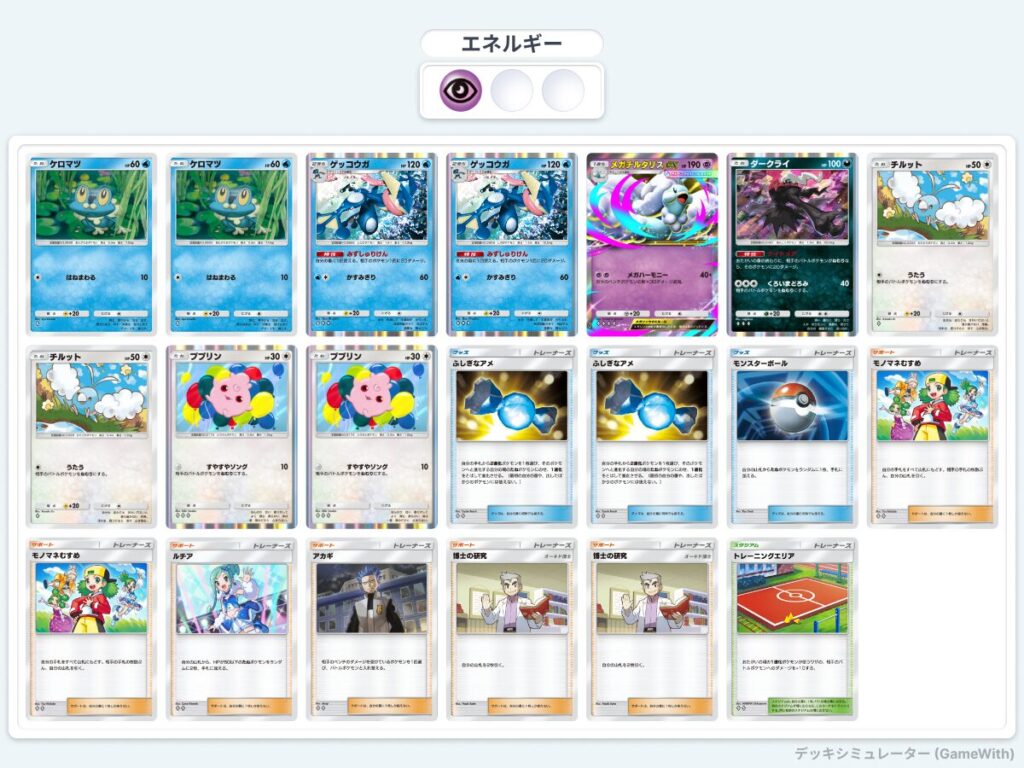 ゲッコウガを抜いた場合は、ダークライを1枚増やし、ゴツゴツメットを追加するのもあり。