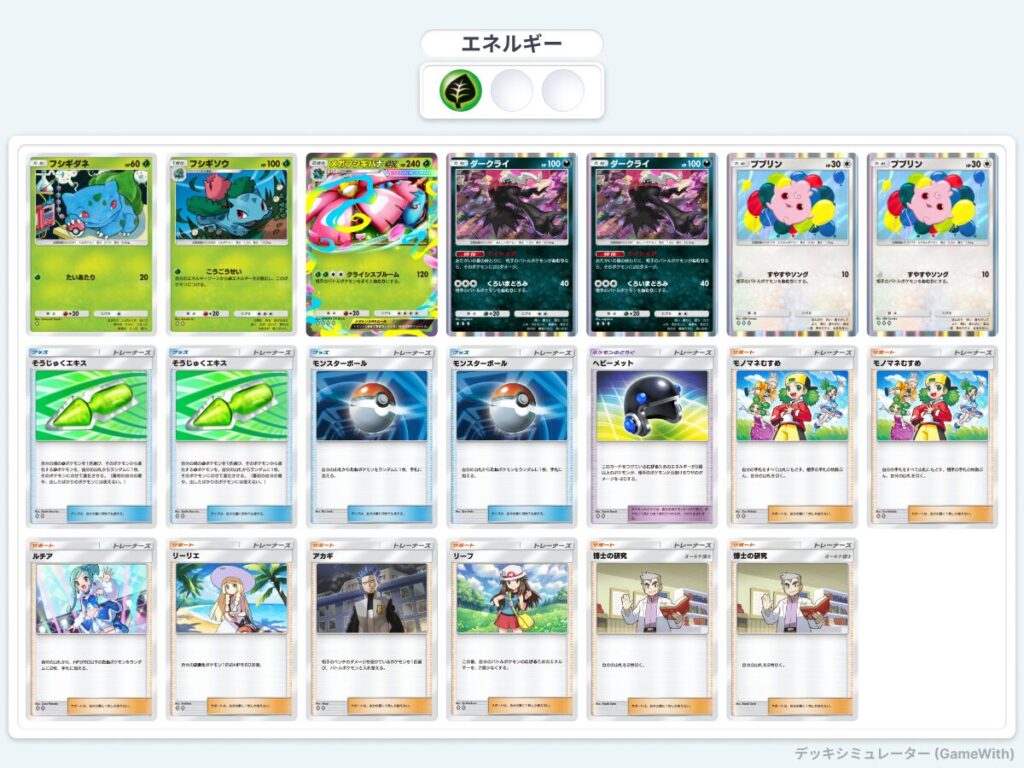メガフシギバナexによってどくも与えていこうという害悪デッキ。フシギソウの「こうごうせい」によりエネルギー加速ができ、ヘビーメットで耐久力も増してうざいこと間違いなし。