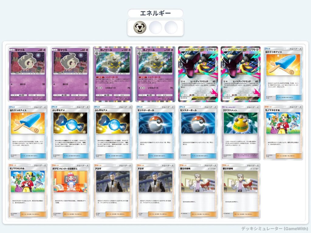 新たに加わったサポートカード「ハルカ」で必要なポケモンを引き寄せる。最近は手札枚数が多い傾向があるので、モノマネむすめも優位に働くことが多い。