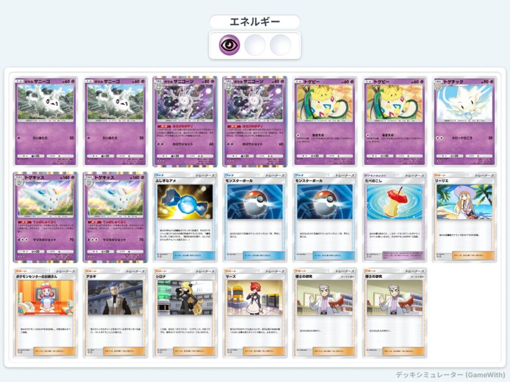ガラルサニゴーンで道連れ、トゲキッスでダメージ無効をコイントスの運に任せるデッキ。